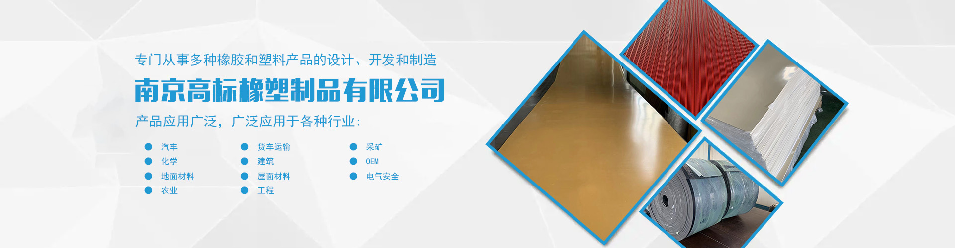 南京高標(biāo)橡塑制品有限公司是一家專業(yè)的橡膠板、橡膠制品和熱塑性塑料產(chǎn)品的制造商。主營產(chǎn)品:三元乙丙橡膠板,丁腈橡膠版,氯丁橡膠板,丁苯橡膠板,丁基橡膠板,天然橡膠板,硅橡膠板,氟橡膠板,絕緣,防靜電,導(dǎo)電橡膠板,夾布,夾金屬網(wǎng)橡膠板,耐酸堿橡膠板,耐油橡膠板,耐磨橡膠板,阻燃橡膠板,阻尼橡膠板,減震橡膠板,防滑橡膠板,橡膠墊片等。 高標(biāo)橡塑專門從事多種橡膠和塑料產(chǎn)品的設(shè)計、開發(fā)和制造。我們的產(chǎn)品應(yīng)用廣泛。廣泛應(yīng)用于各種行業(yè),包括:汽車,貨車運輸,采礦,化學(xué),建筑,OEM,地面材料,屋面材料,電氣安全,農(nóng)業(yè),工程等。 高標(biāo)橡塑的客戶服務(wù)于許多行業(yè),包括墊片切割、分銷商、工業(yè)用品零售商和批發(fā)商。自